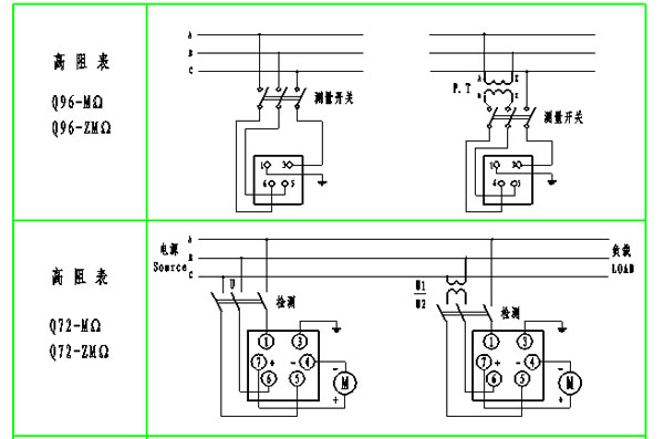 高阻表測量范圍額定電壓0-5MΩ100V、127V ﹑220V、380V、400V、440V380V(經(jīng)380/100V或380/127V.P.T接入) 接線圖: