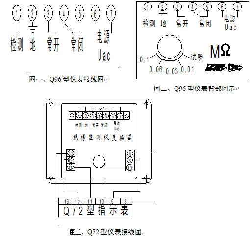 概述 | 主要參數(shù)和技術指標 ● 儀表指示偏轉(zhuǎn)角:Q96-MΩA、Q72-MΩA,90°Q96-ZMΩA、Q72-ZMΩA, 240° ● 使用環(huán)境溫度范圍:-25℃~+55℃ ● 耐振動:頻率1~100Hz,加速度≤10m/s2 ● 絕緣強度:線路對外殼2000Vac,1min ● 外磁場強度:≤400A/m ● 儀表準確度等級:⑩級(基準值為指示值,按GB/T7676-1998中相關要求) ● 工作電源容差:100Vac(或220Vac)±15% ● 儀表消耗功率:不大于5VA ● 輸出觸點容量:阻性,28V,5A;220V,1A ● 報警設置及容差:10kΩ±2kΩ;30kΩ±3kΩ 60kΩ±3kΩ;100kΩ±5kΩ ● 儀表重量:Q96-ZMΩA、Q72-ZMΩA, 1.1kg Q96-MΩA、Q72-MΩA, 0.9kg |